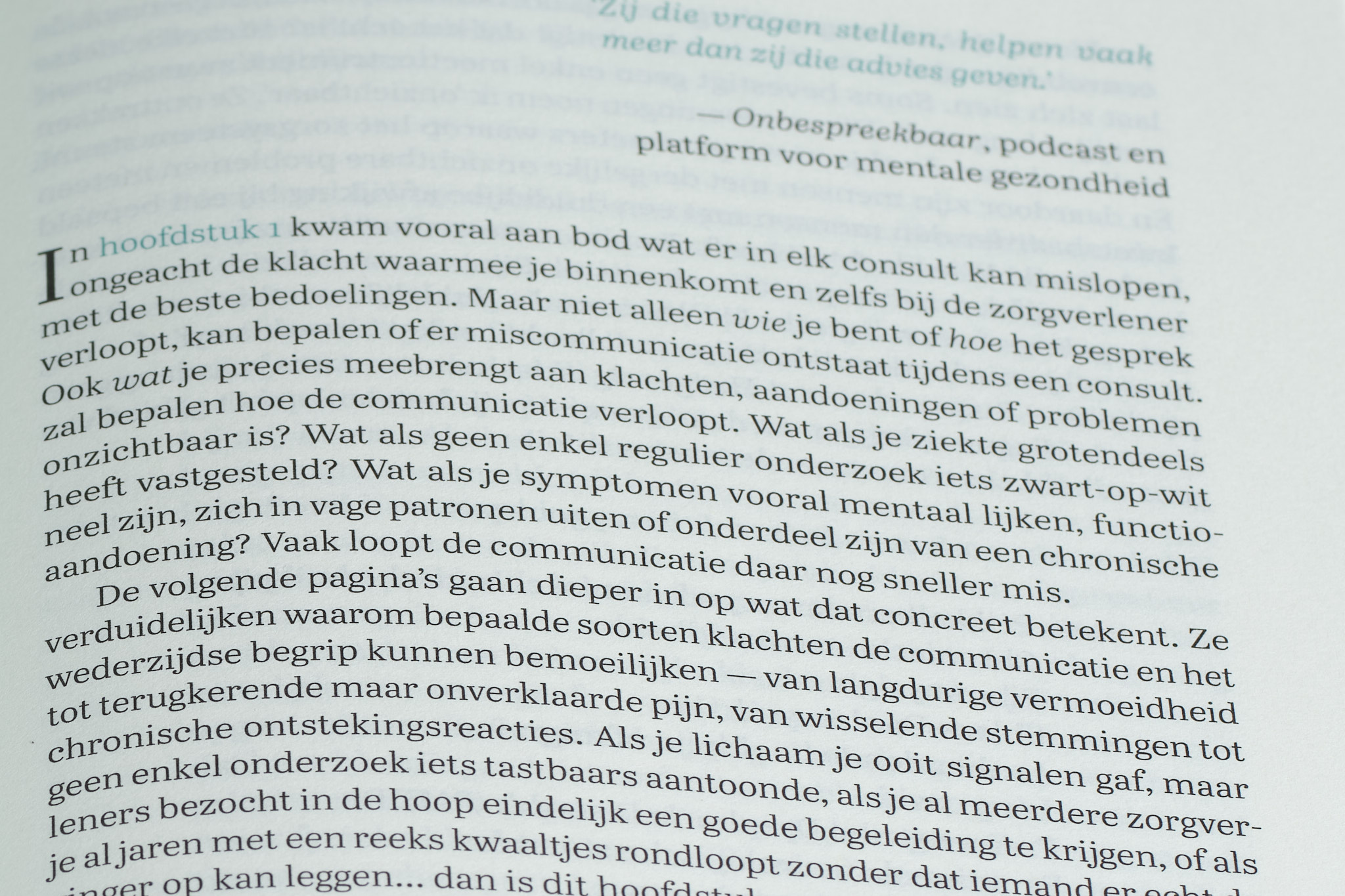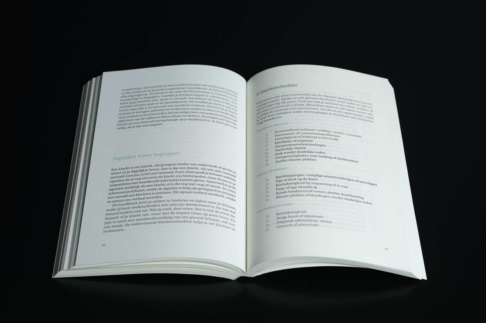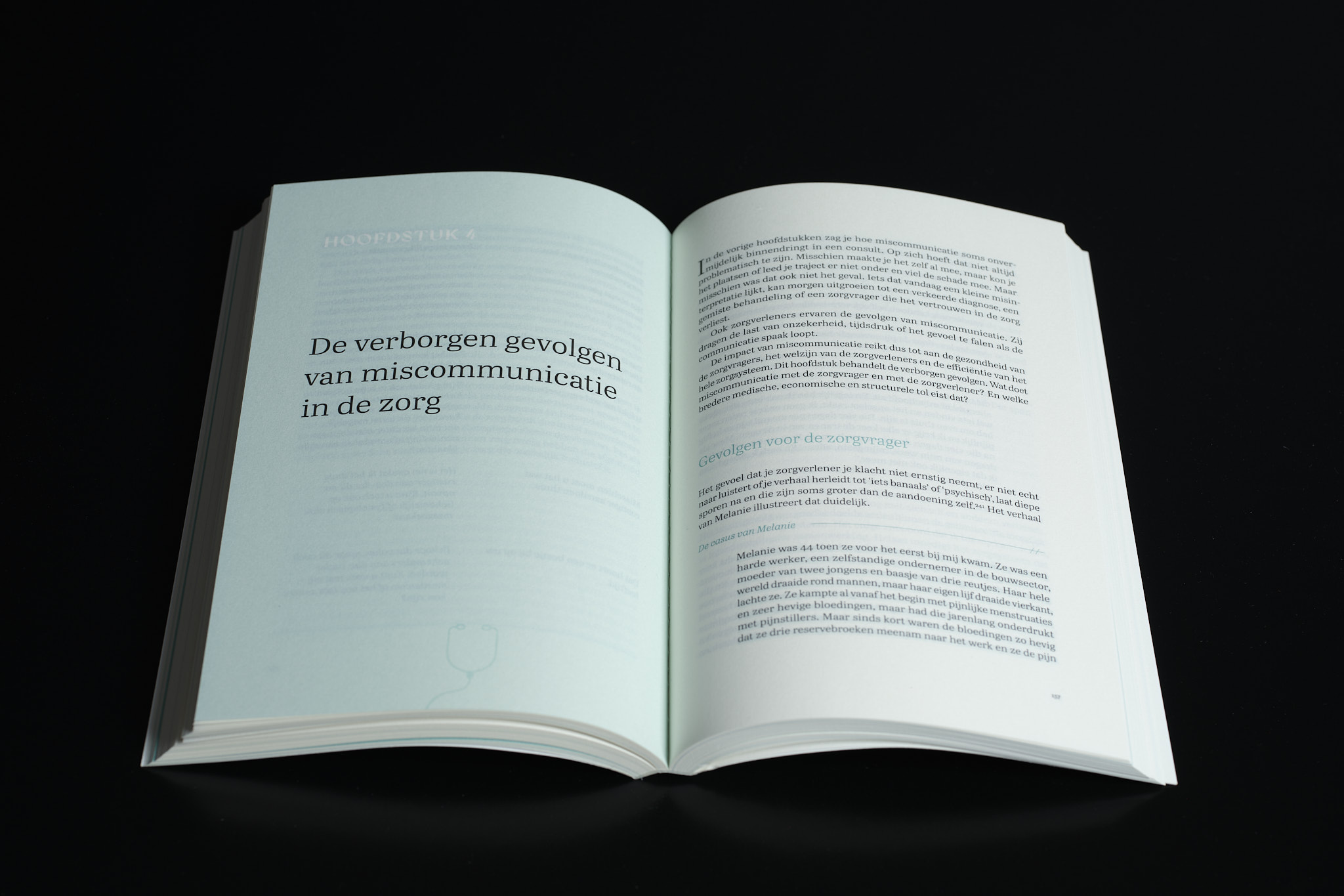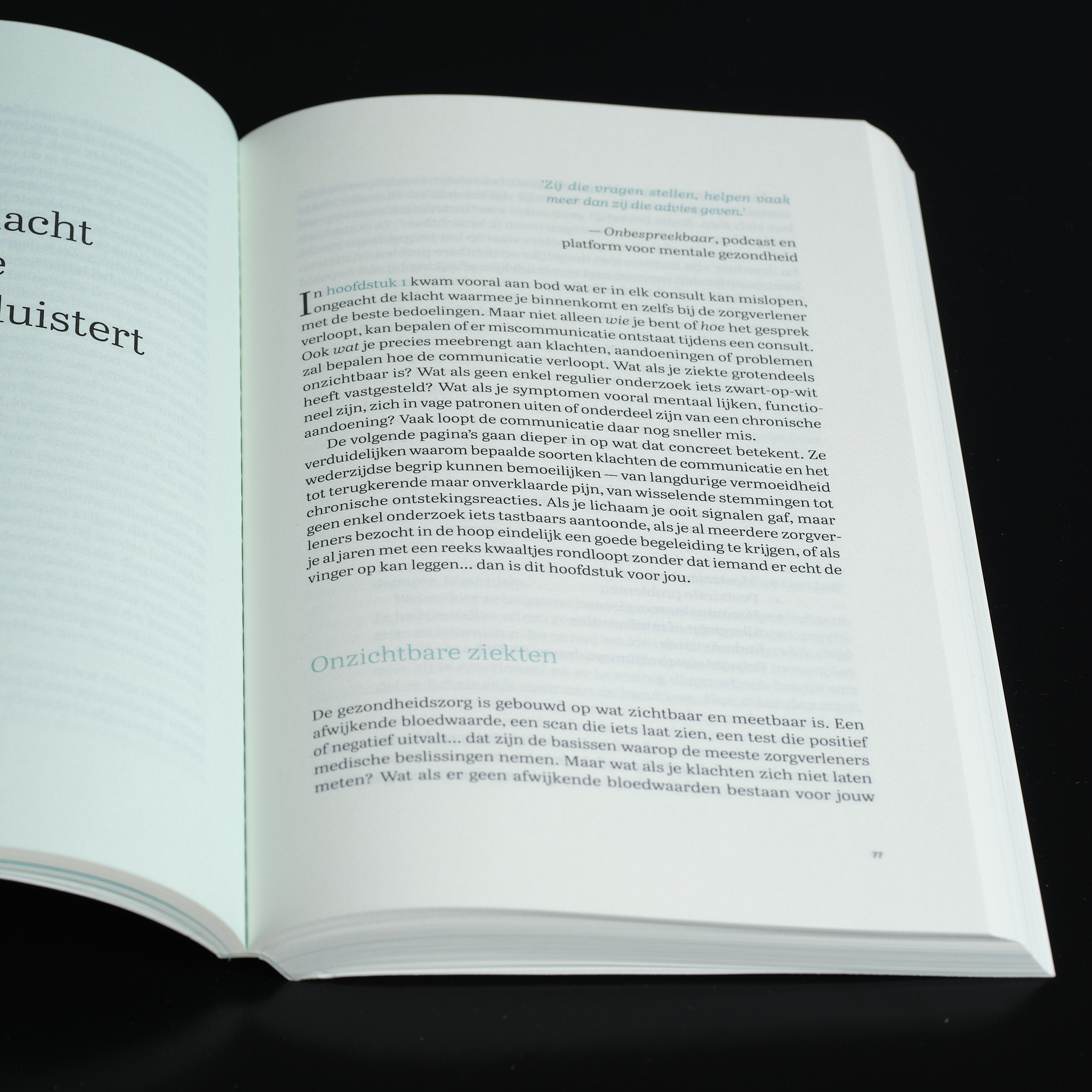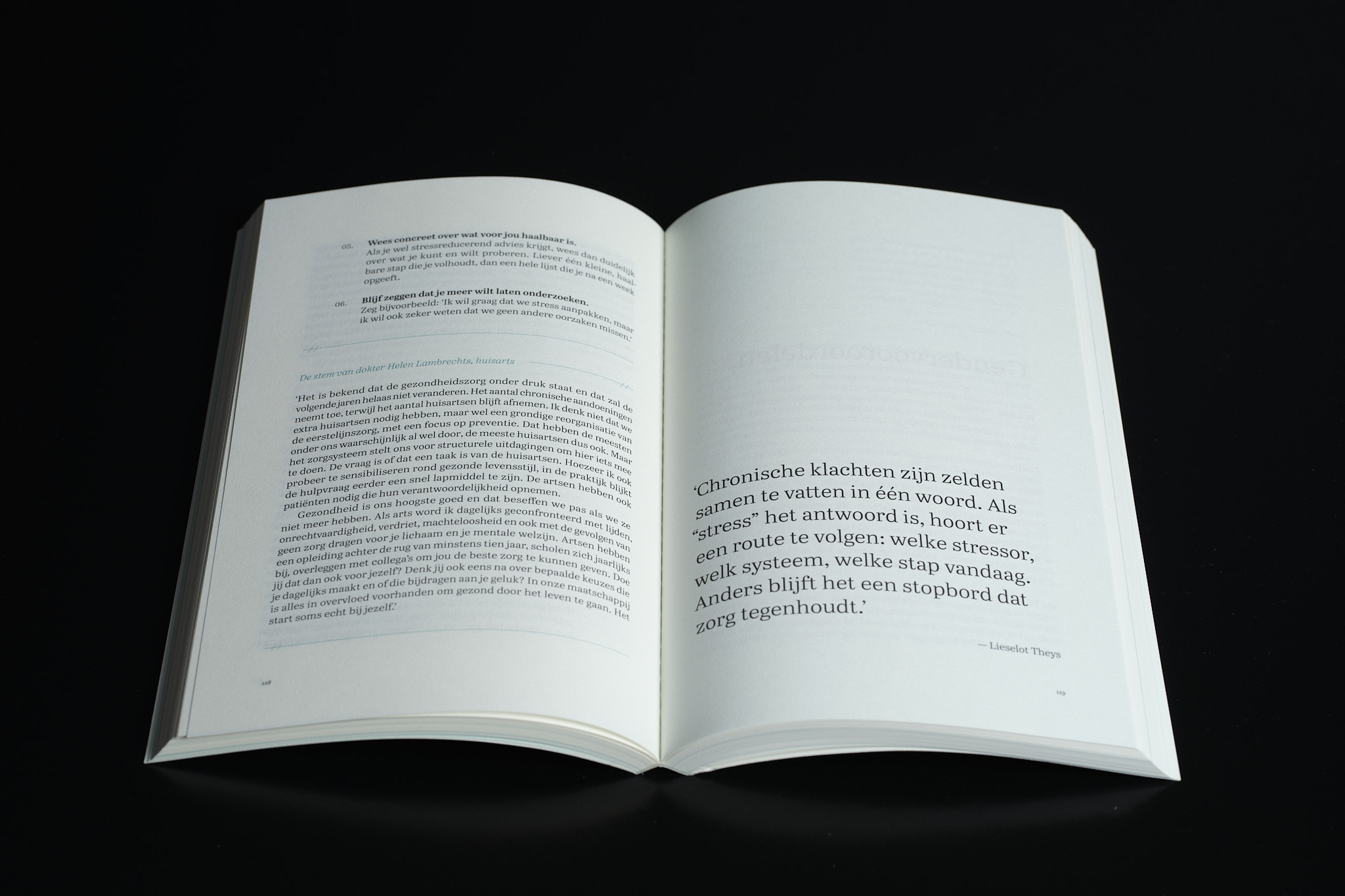 In het hele boek wordt op verschillende manieren ruimte gecreëerd voor notities: de citaten in de doorlopende tekst gebruiken de helft van de zetbreedte en worden uitgelijnd aan de buitenzijde van het tekstblok, de casussen krijgen een extra inspringing van viermaal de em-spatie, subtitels worden van extra witruimte voorzien zonder overdaad. De illustratie van de stethoscoop — ontworpen door Leen Depooter voor de cover — wordt op strategische plaatsen ingezet om de tekst voldoende ademruimte te geven zonder het ritme van het boek te doorbreken.