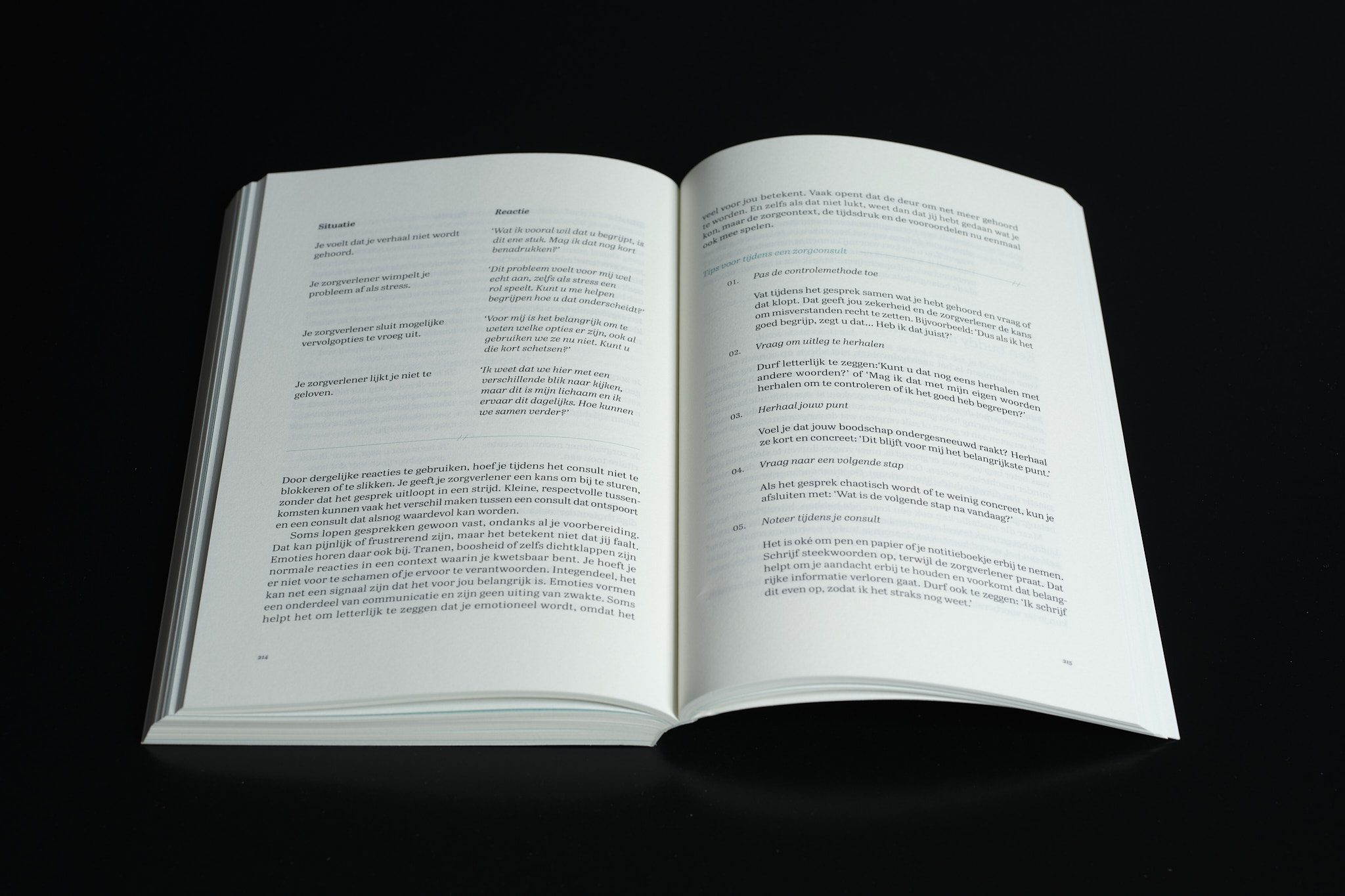 Lieselot moedigt de lezer aan om haar boek niet enkel te lezen maar ook te gebruiken, liefst met een pen en een fluostift bij de hand. Ik heb ervoor gekozen om geen tekst te zetten in de kop- en voetregels, met uitzondering van de paginanummering, om zo meer ruimte te scheppen. Haar idee van de fluostift heeft mij geïnspireerd om de casussen te stijlen op een gelijkaardige manier.