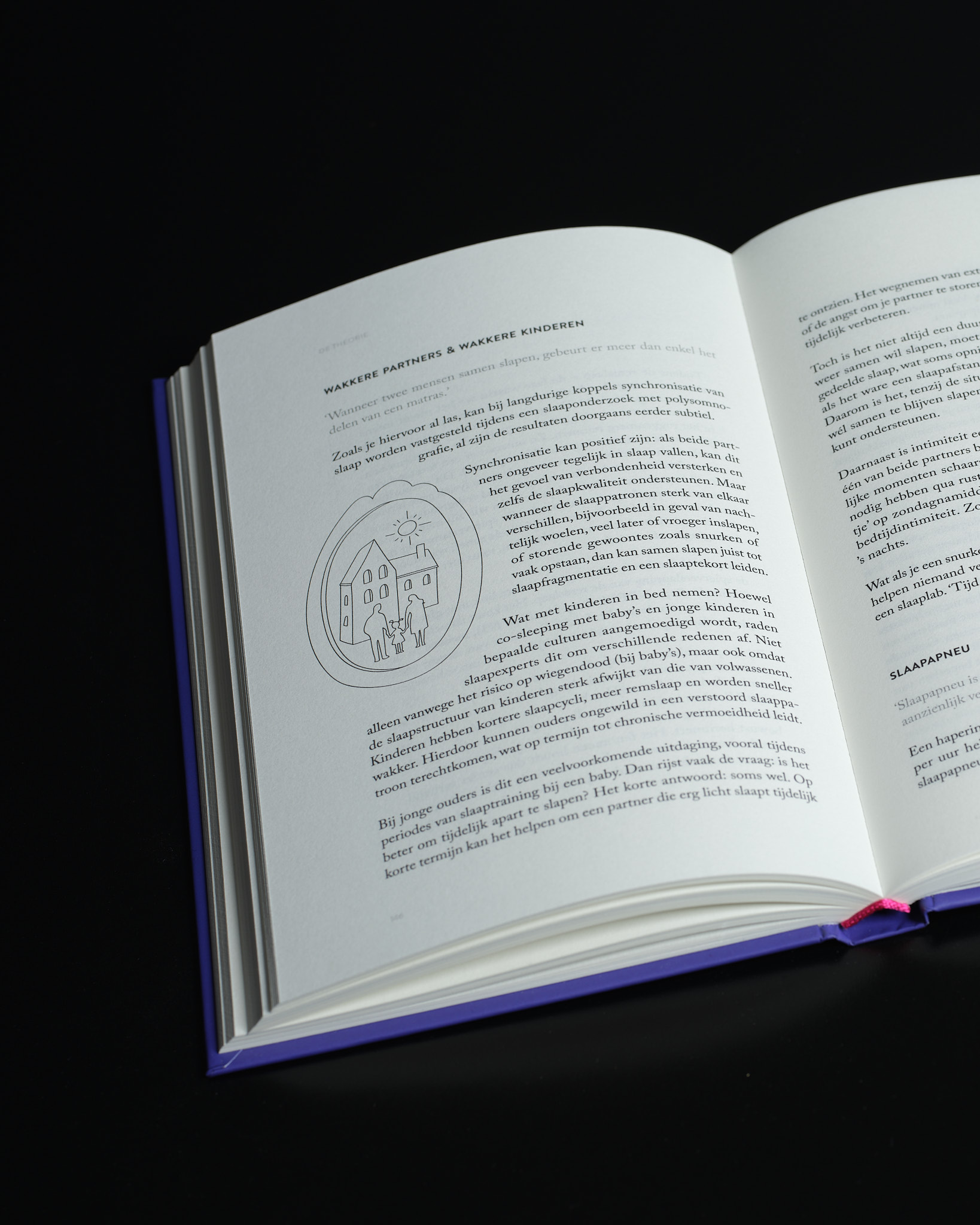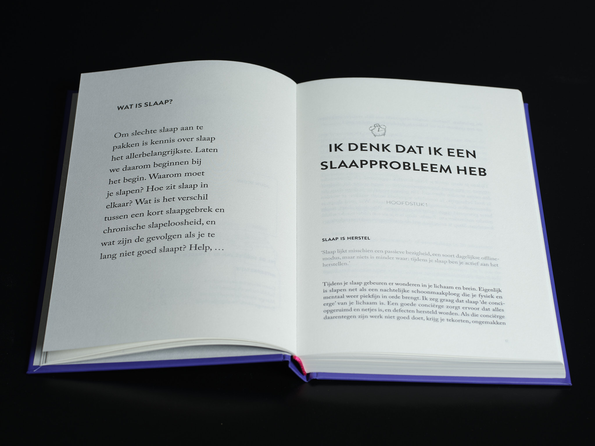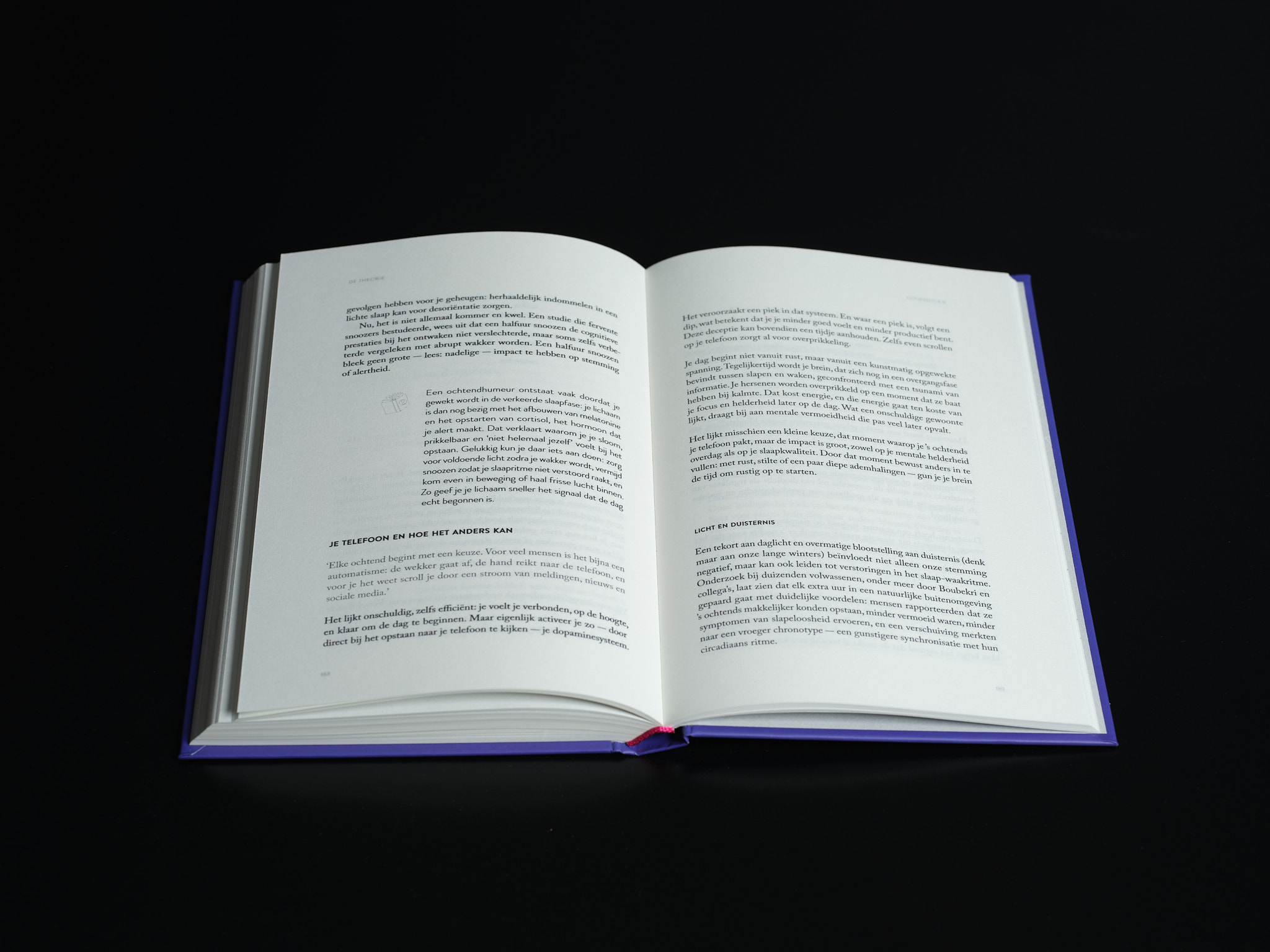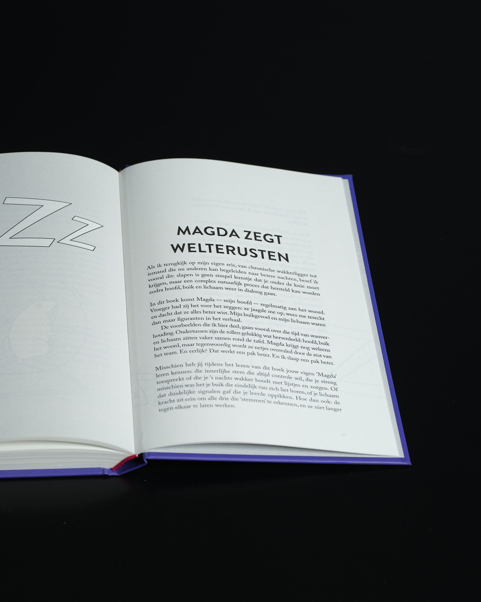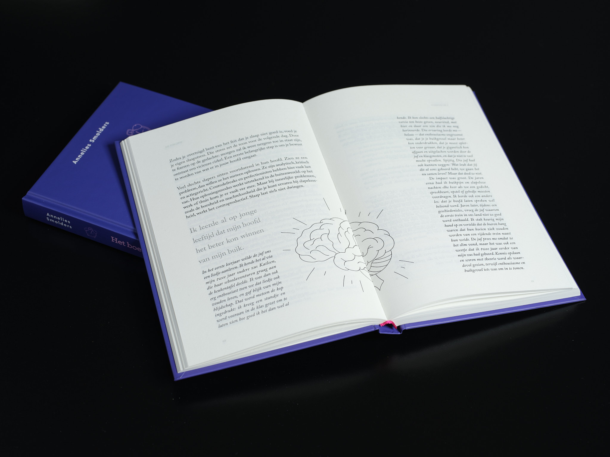 Annelies heeft een boek vol nuttige informatie en praktische tips geschreven. Het was dan ook een uitdaging om de juiste balans te vinden tussen tekst en witruimte. Ten slotte dient Het boek waarvan je in slaap valt als een rustpunt in onze drukgevulde dagen. Zonder het aspect van een leesboek te verliezen, straalt het binnenwerk een enorme rust uit.